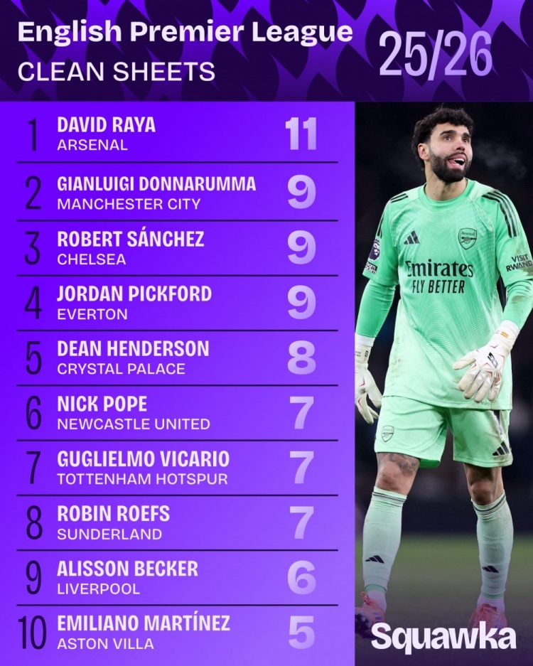 水晶宫门将迪恩·亨德森8次零封位列第五,纽卡门将波普、热刺门将维卡里奥以及桑德兰门将罗夫斯7次零封位列六至八位。